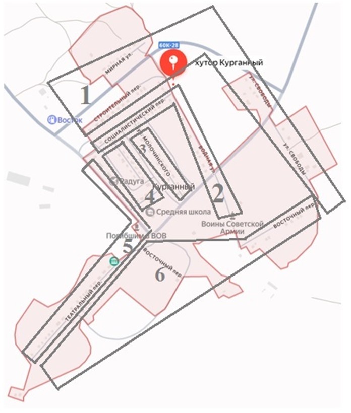 Центр х. Курганный Границы: х. Курганный от пер.Социалистический по ул. Молодежной (включая все дома) до пер. Школьный, по пер. Школьный (включая все дома) до ул. Почтовой,в том числе жилые дома: ул.Молодежная:15,14,13,12,11,10,9,8,7,6,5,4,3,2,1 пер. Школьный:5,4,3,2,1. |