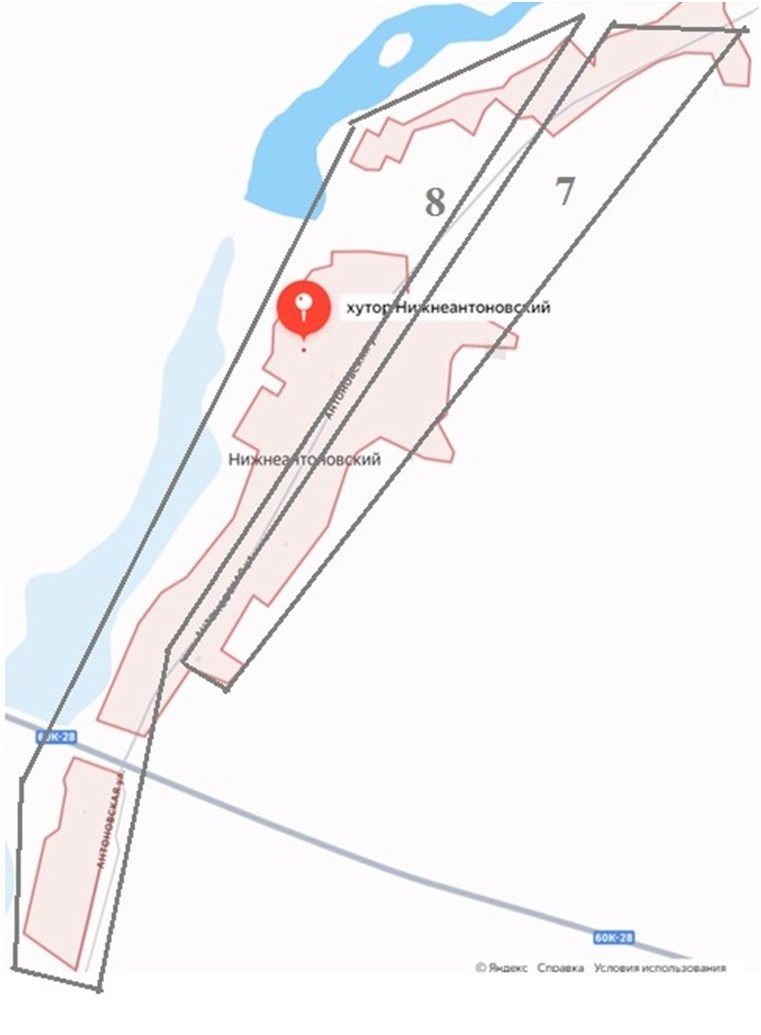 Центр х. Нижнеантоновский Границы: х. Нижнеантоновский от жилого дома № 10 по ул.Антоновской (четная сторона) жилые дома -№№ 12,14,16,18,20,22, 26,28,30,32,34,36,38, 40, 44,48,50,54,56,60,64,66,68,70,72,74,76,78. до южной части хутора. |